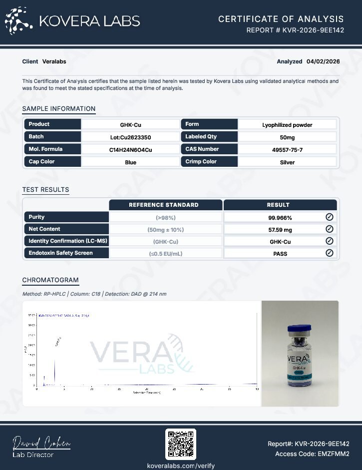 GHK-Cu is a copper-peptide complex used in research exploring regenerative signaling, collagen and matrix biology, and oxidative stress modulation. Studies often focus on skin and tissue models to evaluate pathways linked to repair, remodeling, and cellular communication. Supplied for research use only.VIEW COA HERE —>COA-CU50 4/3/26